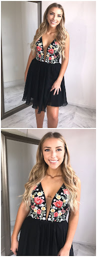 For evening wear, why not try a double slit halter maxi dress with a deep keyhole neckline, in your choice of peach, blue, or black? No matter what, a short black dress is never outta style! Short sleeve floral / black cutout dress.